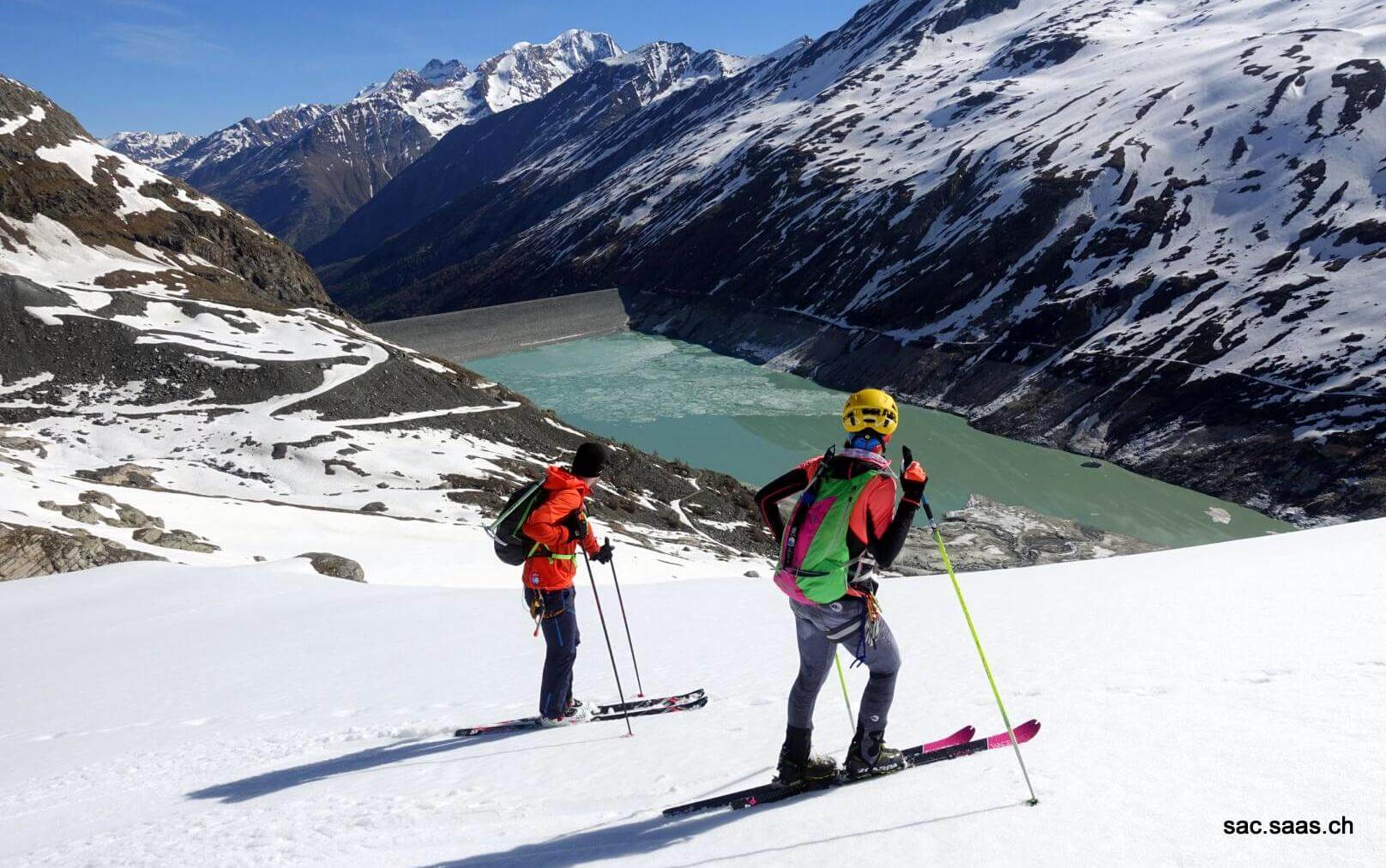 Nach einem gemütlichen Einlaufen erreichten wir schon den Stausee, zu Fuss ging es noch ein paar Minuten weiter bis wir schlussendlich unsere Skischuhe anzogen und mit den Skis weiterliefen. Es war ein wunderschöner Morgen, schöner Sonnenaufgang, keine Wolken, kein Wind, keine anderen Leute … perfekt, es lohnt sich eben doch morgens so früh aufzustehen!