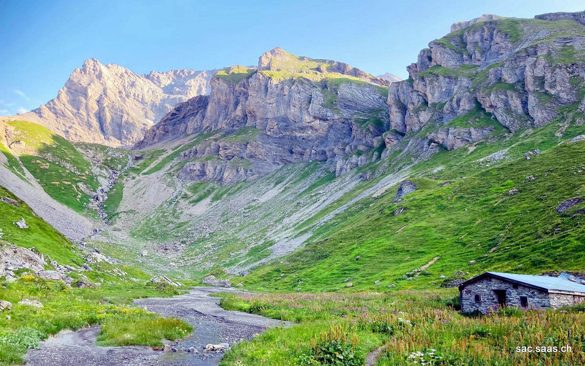 Auf der Hütte angekommen bot sich uns ein wunderschönes Panorama – die Dents du Midi, das Mont Blanc-Massiv, der Grand Combin, sowie natürlich direkt hinter uns, die imposante Steinwand des Grand Muveran. Nebenbei liebäugelten wir bereits mit der vor sich langsam hinbrutzelnden Rösti und einigten uns darauf, nochmals in die Cabane einzukehren.