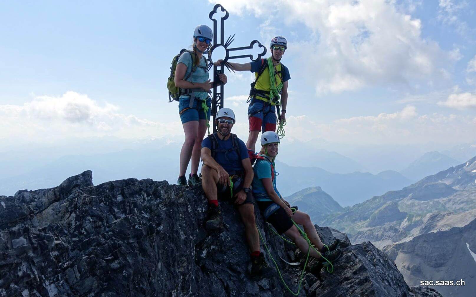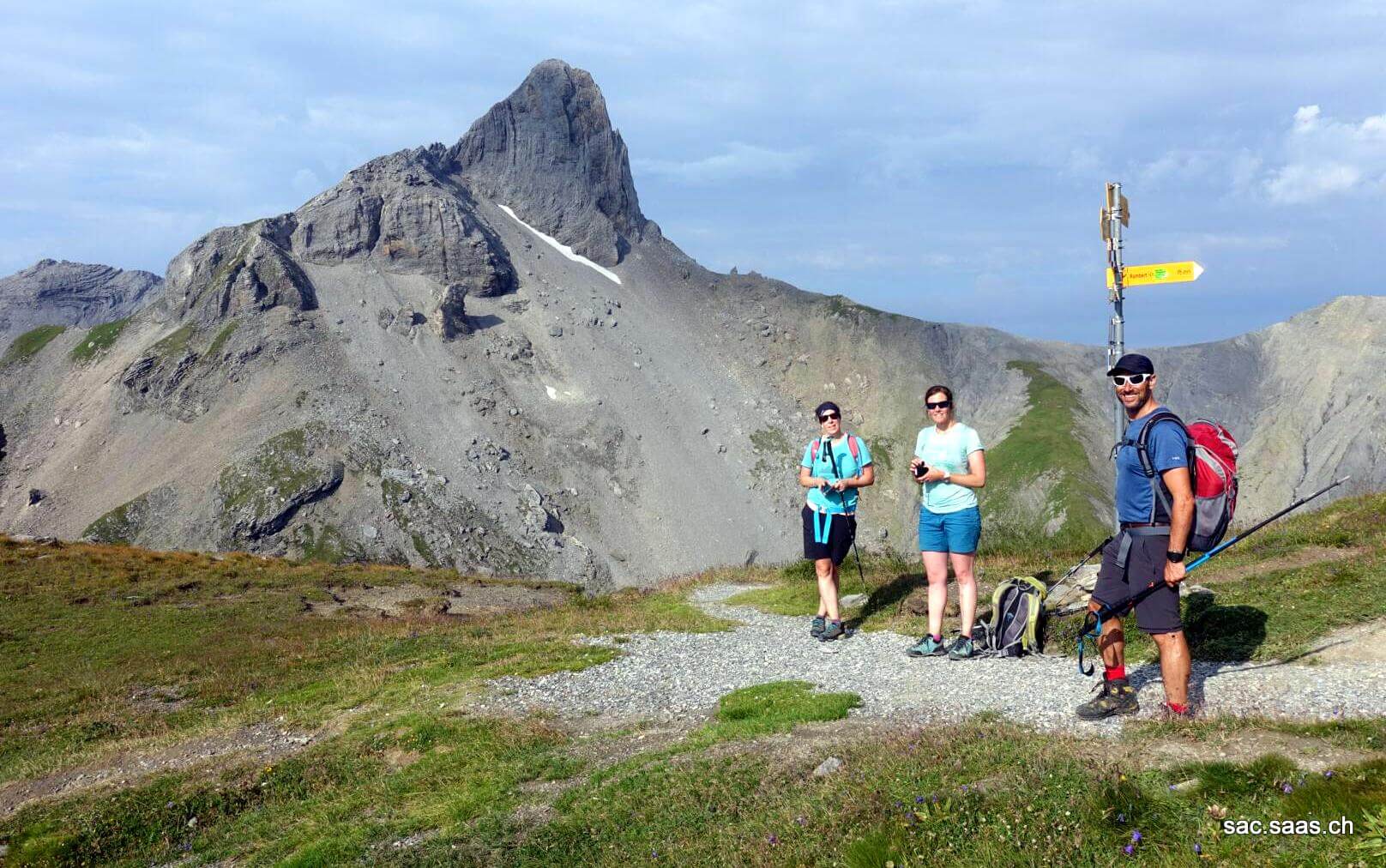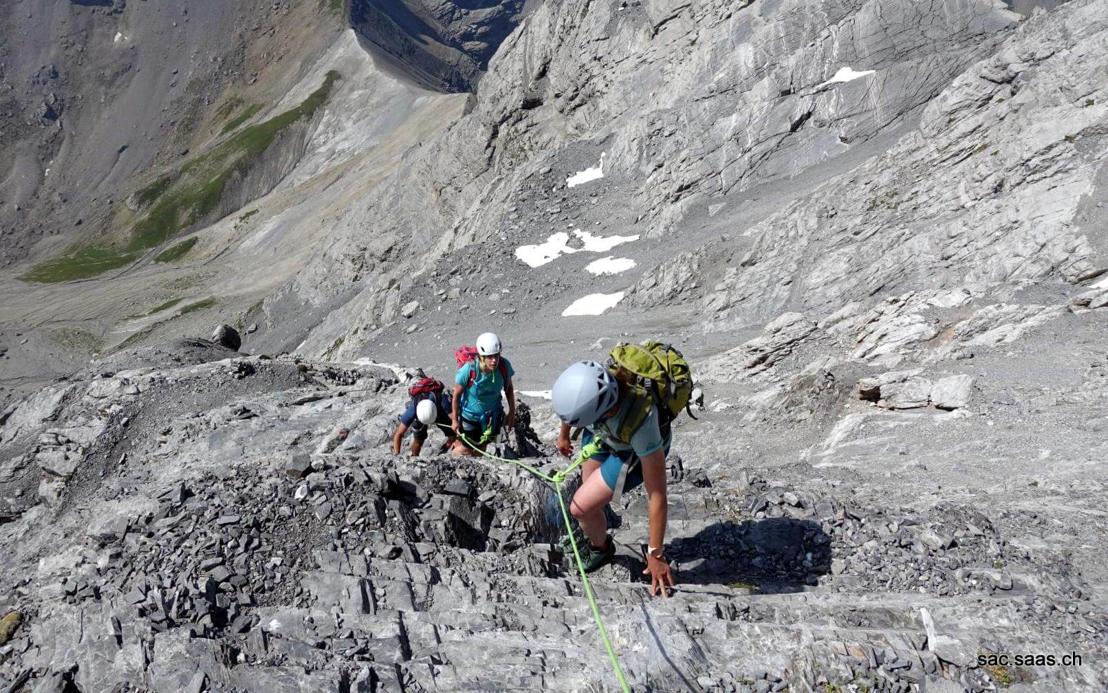 Wir nahmen nun die letzten Meter unter die Füsse, folgten der bunten Markierung und bestaunten zwischendurch noch eine Gruppe von ungefähr 25 Steinböcken. Nach ein paar Kraxeleien und der Querung der Südwand standen wir dann auf dem Gipfel bei angenehmen Temperaturen. Obwohl sich einige der 4000er in den Wolken versteckten, war die Aussicht fantastisch – besonders der Blick ins Rhonetal und zum Genfer See. Aber auch die Tiefblicke in die steilen Wände von Grand Muveran faszinierten uns.