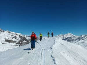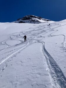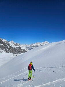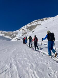 Pünktlich um 6.45Uhr starteten wir zu sechst ab Zer Meiggen auf der Langlaufpiste Richtung Mattmarkstaumauer. Da Karfreitag war, war unser Tourenleiter Claudio mit den frommen Skis( Telemarkskis) unterwegs! Wir kamen flott voran und genossen beim Restaurant Mattmark die erst Pause an der Sonne.