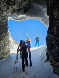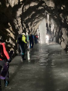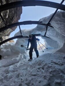 Die Abfahrt in unterschiedlichem Schnee war gut zu meistern. Wir fuhren zur Seestrasse hinunter und fogten der Strasse zum Restaurant Mattmark. Unser Weg führte nun durch 2 Tunnels, wobei das erste total vereist und aalglatt war und mir einigen Respekt einflösste, denn Stürzen würde zu grossen Problemen führen, da Kameradenhilfe fast nicht möglich war – es ging alles Gut und alle erreichten das Tunnelende ohne Zwischenfall. Gott sei Dank!