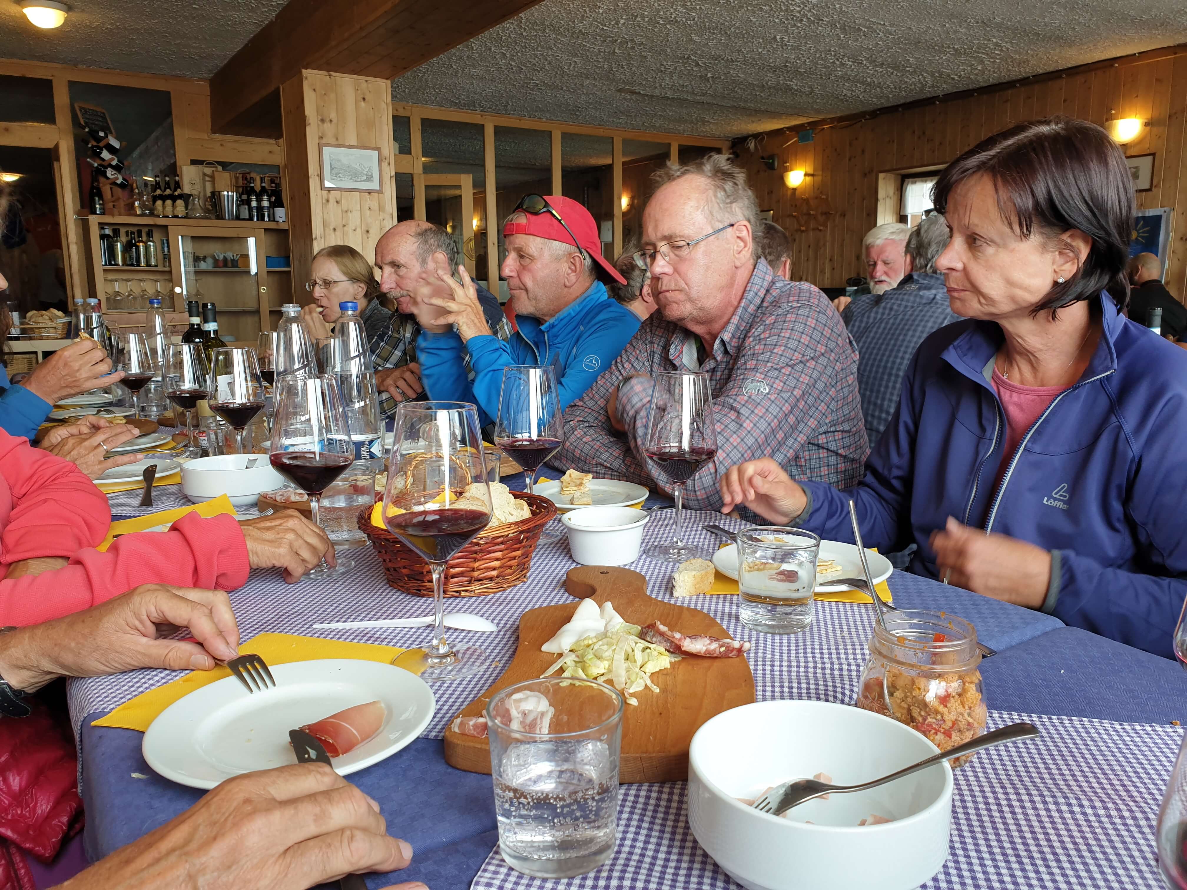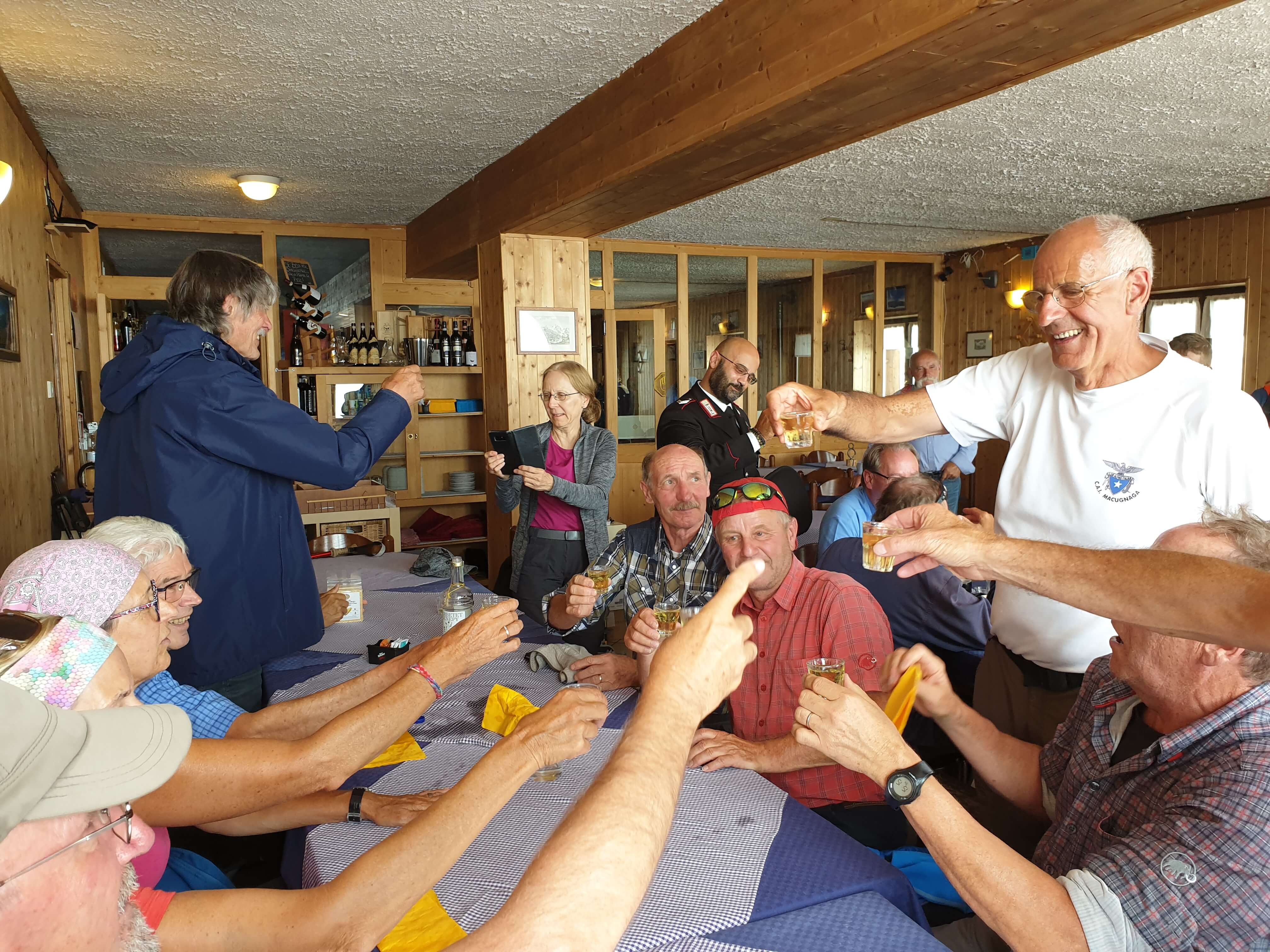 Als wir beim Monte Moro Pass ankamen, feierten wir mit unseren Freunden und Bekannten von der italienischen Seite die heilige Messe. Es waren wiederum mehrere Priester aus Italien und der Schweiz anwesend, welche unter der Leitung von Pfarrer Amadée Brigger gemeinsam die Messe zelebrierten. Im Anschluss gab es den von den Saasern Gemeinden offerierten Apero. Der feine Tropfen «Fendant Domherrenwein» mutete allen. Danach gingen die Wege bereits wieder auseinander. Einige traten bereits den Rückweg an, einige fuhren mit der Seilbahn nach Macugnaga und wir, der grösste Teil vom SAC, trafen uns mit den Priestern und unseren Freunden aus Macugnaga im Rifugio Oberto Maroli zum Mittagessen. Nachdem wir geschlemmert hatten, gemütlich beisammen waren und das eine oder andere Liedchen gesungen hatten, machten wir uns auf den Rückweg. Beim Staudamm angekommen, reichte es noch kurz für einen gemeinsamen Abschiedsdrunk im Restaurant Mattmark, bevor wir uns voneinander verabschiedeten.