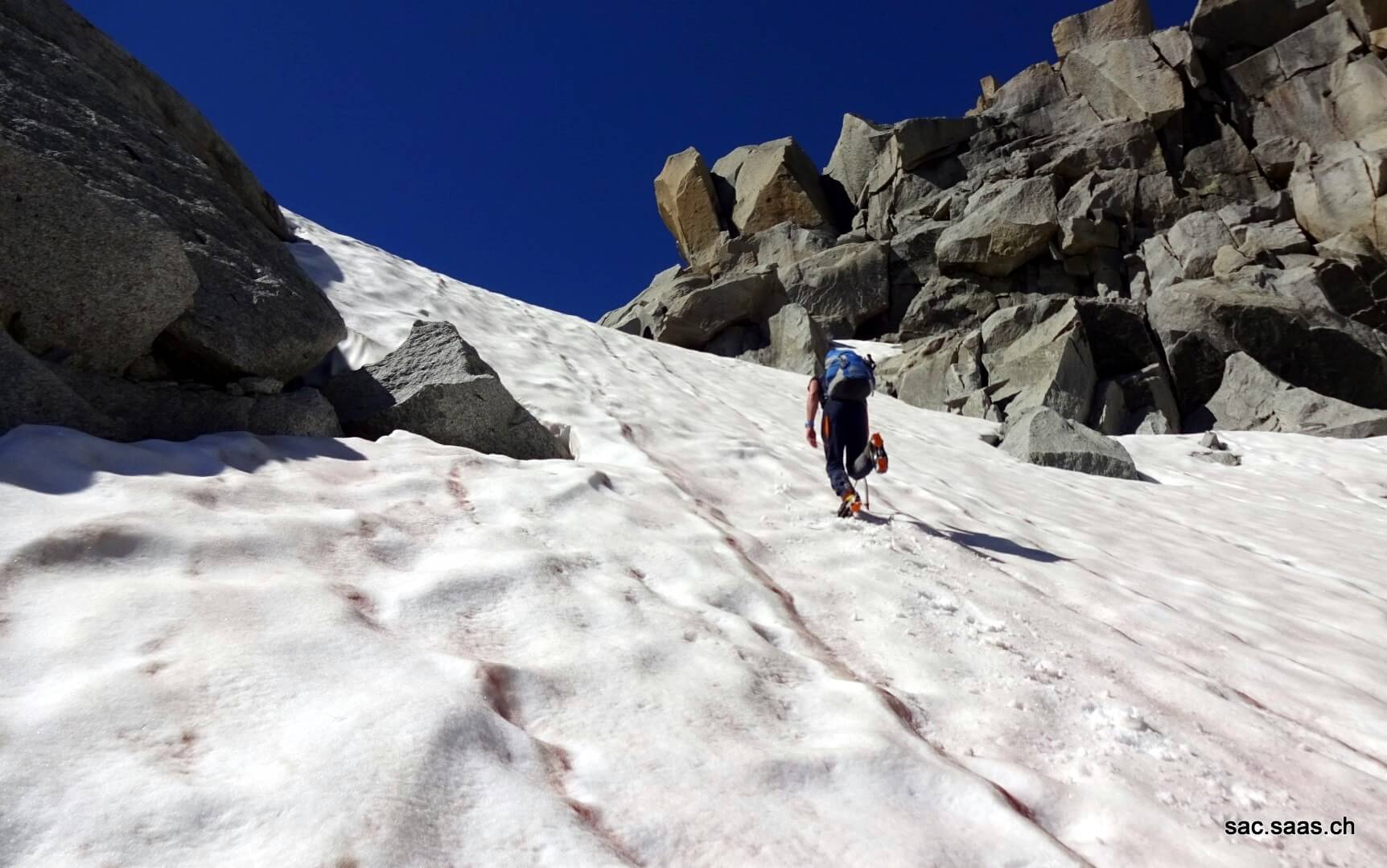 Das Motto „Mini“ und „Plastik“ zog sich dann auch durchs Frühstück – aber wer achtet im Halbschlaf schon auf so Zeug?! Als uns dann mit den ersten Sonnenstrahlen auch die Lebensgeister so langsam erreichten, waren wir schon mitten auf dem Gletscher, wo wir in der wunderschönen Morgenstimmung gemächlich Richtung Sustenhorn stapften. Spätestens aber auf dem Gipfel, mit seiner atemberaubenden 360°-Aussicht, strotzten wir dann alle wieder vor Energie und Glück. Im Freudentaumel ging’s dann ziemlich schnell übers Sustenlimi Richtung Chelenalptal. Mit beiden Steigeisen fest an den Füssen (was an diesem Tag scheinbar nicht alle Steingletscher-Gänger so souverän geschafft haben – hallo?!), verliessen wir kurz darauf Schnee und Eis und steuerten auf direktem Weg die Chelenalphütte an. Das in diesen Tiefen herrschende, nahezu tropische Klima und die herzliche Gastfreundschaft von ChelenalPetra und ihrer Familie verführten zum Biertrinken auf der sonnenüberfluteten Terrasse der charismatischen Berghütte …und auch wenn wir bereits vor dem Mittag ankamen, verlor diese Verführung ihren Reiz den ganzen Tan lang nicht. (Die Muskeln waren an diesem Tag wohl die letzten Körperteile, die Gefahr liefen einen Kater zu kriegen.)