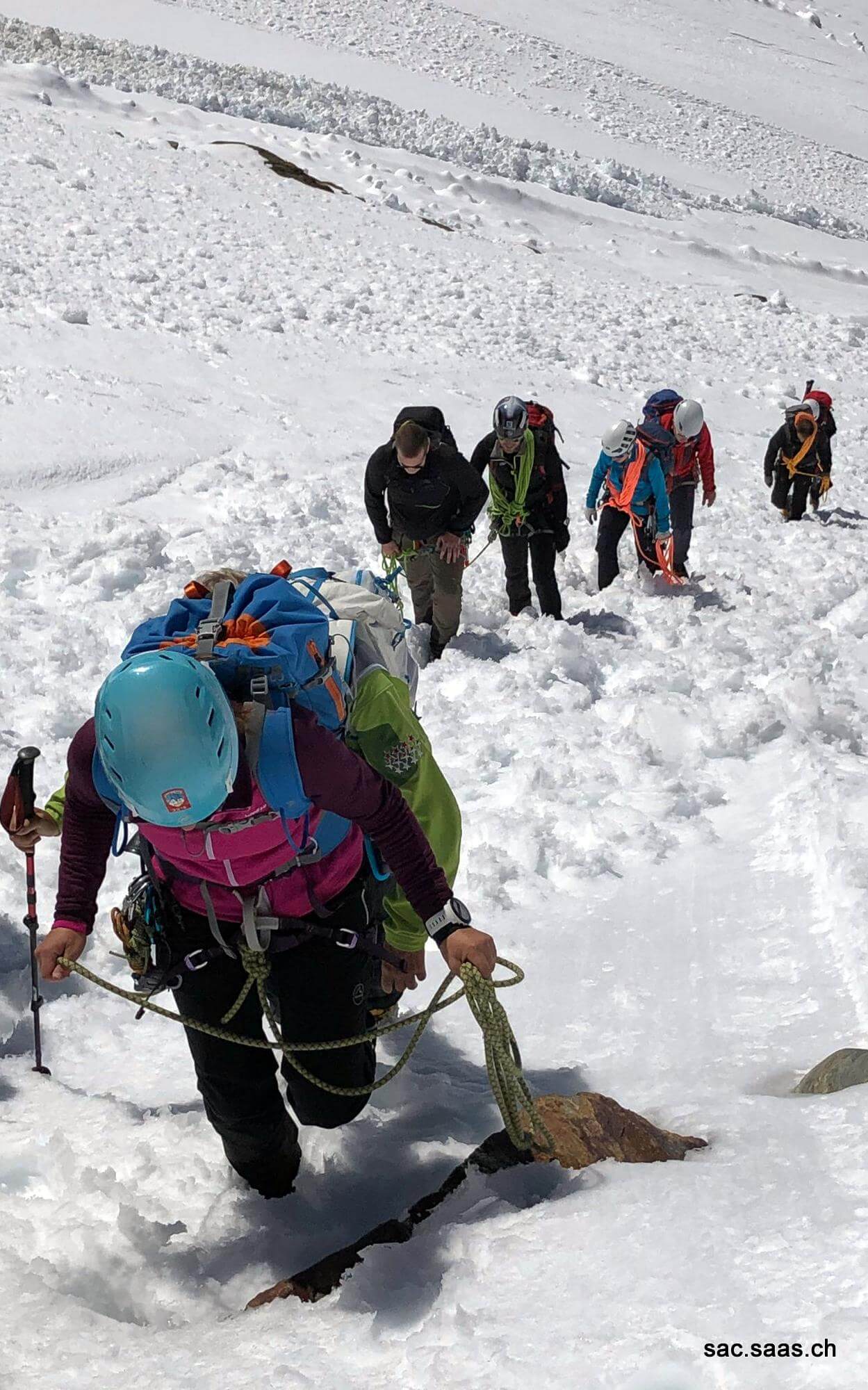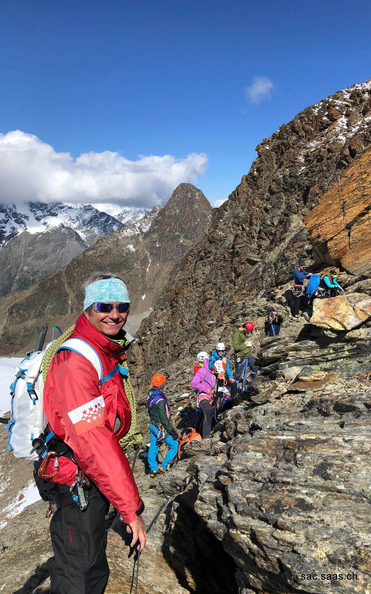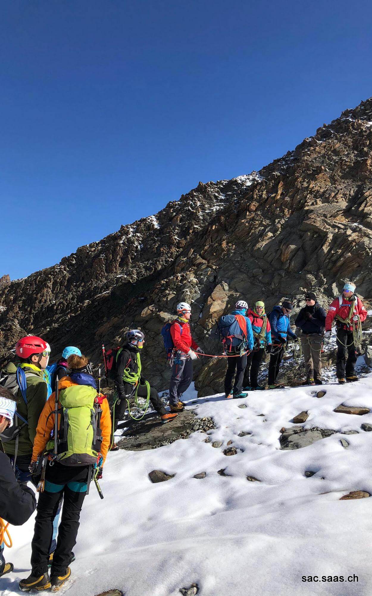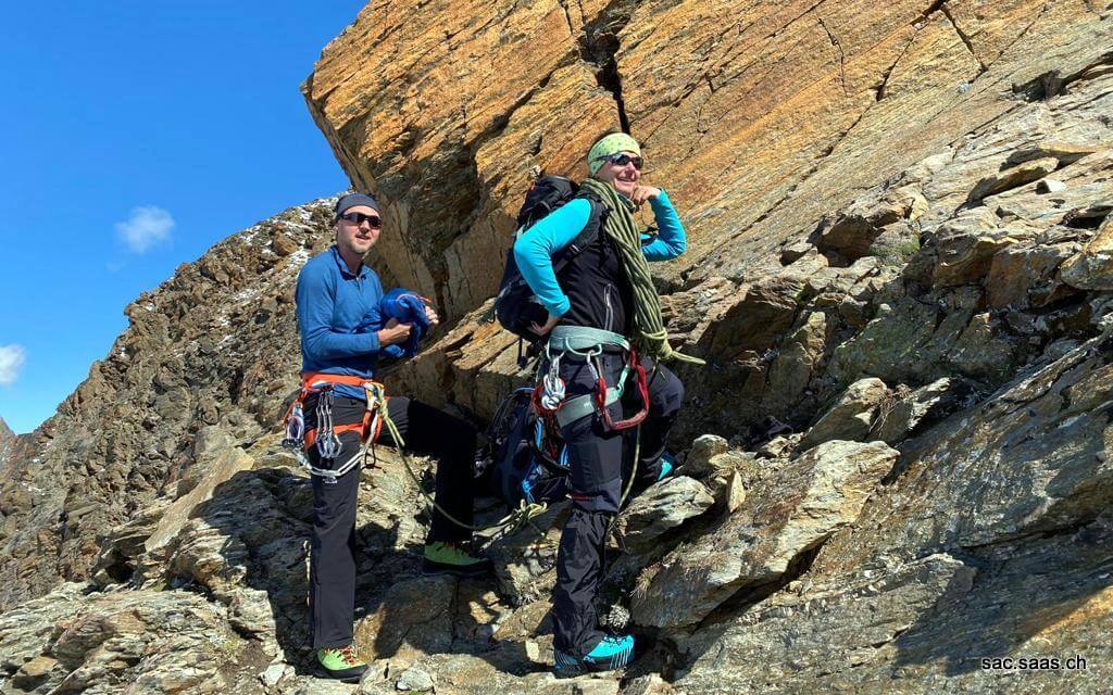 Nach den Instruktionen durch Danny bildeten wir Zweierseilschaften und begaben uns Richtung Lagginsüdgrat. Bei der Traverse unter dem Lagginhorngletscher mussten einige Lawinenkegel überquert werden. Unter Anleitung von Danny stiegen wir in gemächlichem Bergführerschritt hoch bis zum Einstieg am Grat. Auf dem Grat wurde das gelernte gekonnt angewandt. Auf ca. 3350m waren wir an unserem Wendepunkt angekommen, wo wir eine verdiente Pause einlegten. Anschliessend ging es nach einer Instruktion zu Seilhandling und Taktik beim Abstieg zurück Richtung Hohsaas.
