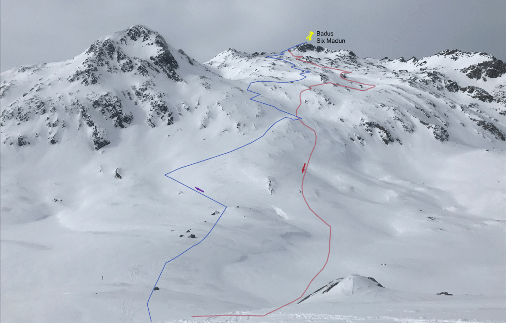Neuer Tag, neues Glück… Aufstehen am 6:30 Uhr, Abfahrt 7:30 Uhr in Richtung Piz Badus /Six Madun. Das Wetter ist leider nicht mehr so schön wie am Tag zuvor und der Anstieg ist von Anfang an eher steil. Wir laufen ca. 2 Stunden bis auf den Six Madun (2928m). Kurz vor dem Gipfel richten wir ein Skidepot ein. Mit den Steigeisen bewältigen wir die letzten 100 HM auf den Gipfel. Oben geniessen wir erneut ein atemberaubendes Bergpanorama.
