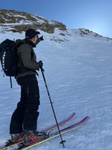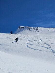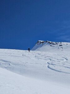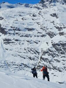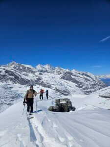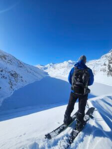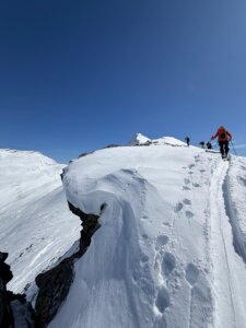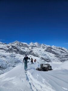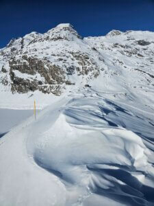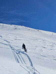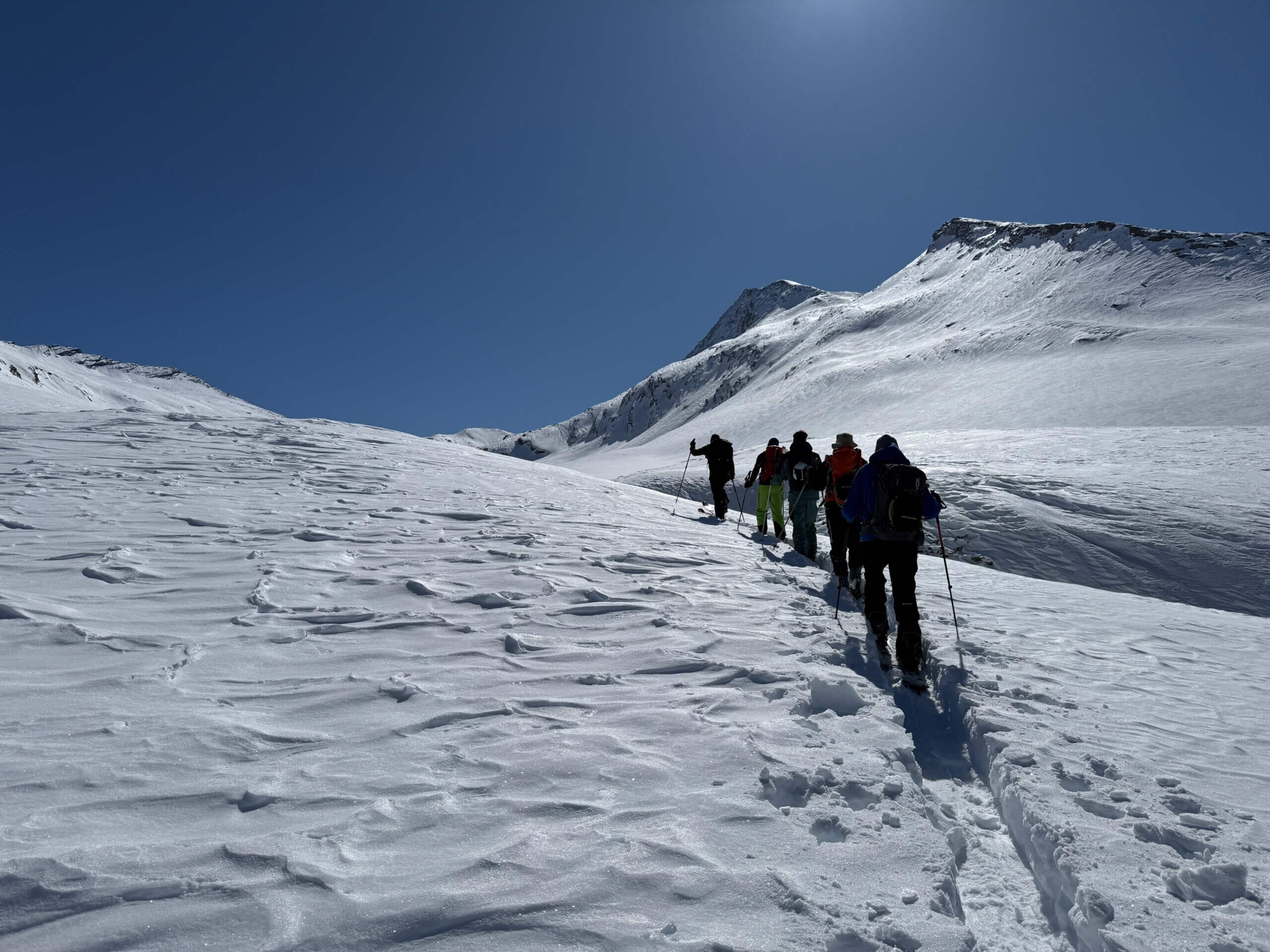 Dort fellten wir noch einmal auf und stiegen zurück zum Staudamm auf. Dieser kurze Gegenanstieg wurde mit einer weiteren tollen Abfahrt belohnt. Noch einmal fanden wir feinen Pulverschnee und konnten die letzten Höhenmeter des Tages in vollen Zügen geniessen. Anschliessend fuhren wir entlang der Loipe zurück nach Almagell.