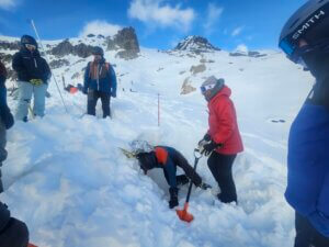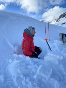Auf einem, dem Wind ausgesetzten, Teil des Grates haben wir die Felle abmontiert und sind zur Lauchernalp abgefahren. Entlang der Abfahrt haben wir ein Schneeprofil erstellt und verschiedene Übungen zum Thema der Verschüttetensuche gemacht.