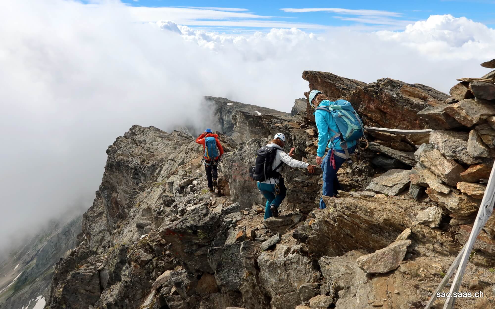 Langsam aber stetig gingen wir Richtung Südosten über kleine Bäche und Steinplatten. Im dichten Nebel blickten wir irgendwann kurz Gämse; später waren es Schafe. Vorne links von uns war der Portjengrat kaum wahrzunehmen. Um 9 Uhr erreichten wir den Sonnigpass (3‘142 m), genau zur Zeit als die Sonne endlich durch den Nebel kam, und uns ein Blick auf Italien werfen liess. Kurze Pause um Windjacken, Klettergurte und Helme anzuziehen, und schon waren wir auf dem Grat Richtung Süden.