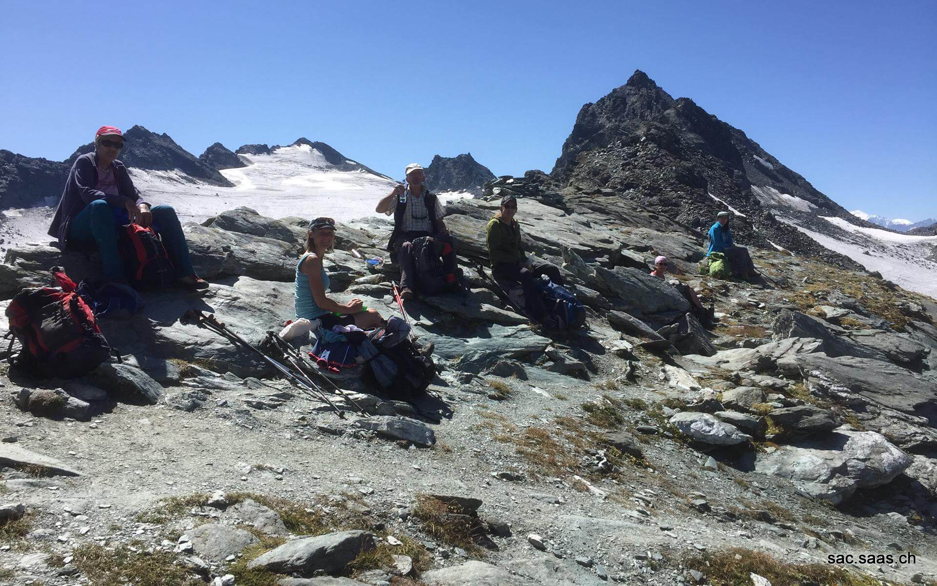 Tonis Tempo war sehr angenehm und gleichmässig. Nach ca. 1 ½ Std. erreichten wir die Cabane de Prafleurie (2662m). Erna, Rita und Rosemarie wollten sich unbedingt die „Flohhütte“ ansehen, derweil die anderen nach kurzem Halt den Aufstieg zum Col de Prafleurie in Angriff nahmen. So kam man bei 2700m bis 2800m in die nicht schöne Landschaft der Letio d’Alleves, wo während dem Bau der Staumauer der notwendige Kies abgebaut wurde. Vieles ist zerfallen, doch einige Ruinen zeugen von dieser Zeit. Es wurde immer steiler und die Schritte kürzer, so dass die 3 Hüttenbesucherinnen wieder aufschliessen konnten. Nach 1 Stunde erreichten alle den Col de Prafleurie (2938m), den höchsten Pass dieser Wanderwoche. Mittagsrast war angesagt. Das herrliche Panorama liessen alle Anstrengungen vergessen.