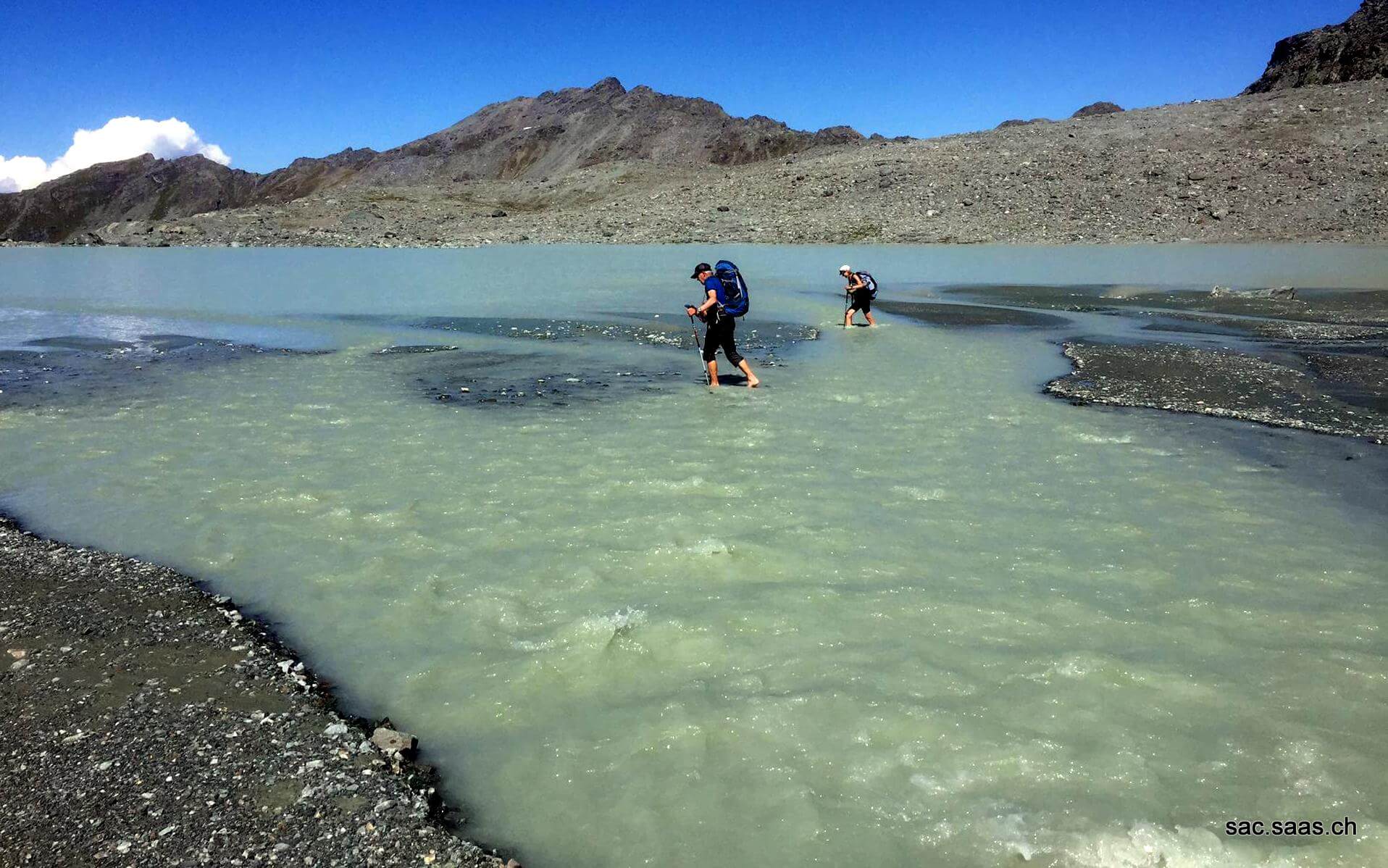 Steinen gefragt. Die Chempfen sind zwar stabil, aber es gab auch viele Wackelsteine, die grosse Aufmerksamkeit verlangten. Kurz vor dem Aufstieg zum 2. Pass war eine Bachquerung fällig. Es hatte enorm viel Wasser (die Gletscher schwitzen auch!!). Da die Steine zum Darüberlaufen unter Wasser standen, blieb uns nichts anderes übrig, als die Schuhen und Socken auf den Rucksack zu binden und so schnell als möglich durch den Bach zu gehen. Das Wasser reichte bis über die Knie und war Ar…kalt.