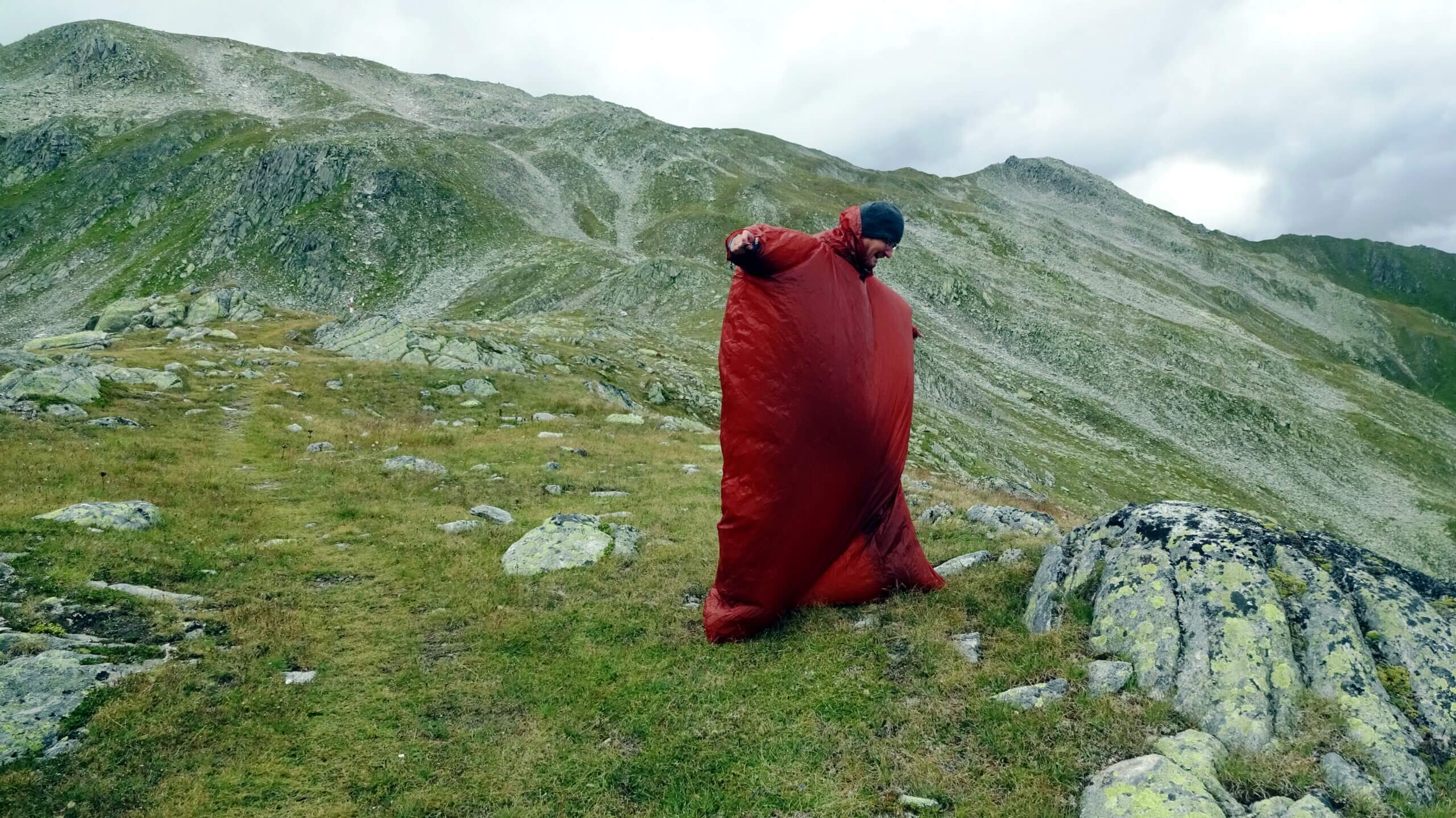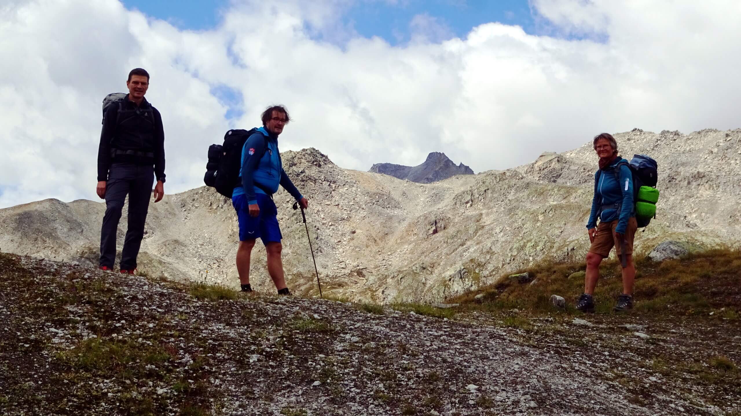 Schwitzlos verweilt’s sich auch am Biwakplatz beim Trützisee. Nebst dem hartnäckigen Wind spüren wir zwetschgendurch auch mal ein paar Regentropfen. Erste Zweifel kommen auf, ob bei der doch überraschend gefühlten tiefen Temperatur, permanentem Wind und allfälligem Regen das Biwak der ultimative Plausch sein wird. Dominic meint «alles kein Problem» und funktioniert schon mal seinen Biwaksack zum Wingsuit um. Falls es funktioniert, wäre er damit nix-komma-null in Geschinen, während wir angeschriebene 2.5 Stunden den Regen und Wind vom Leibe marschieren müssten. Hmm, wir vertrauen unserem Tourenleiter und kurz und kürzer scheint ja auch mal die Sonne.