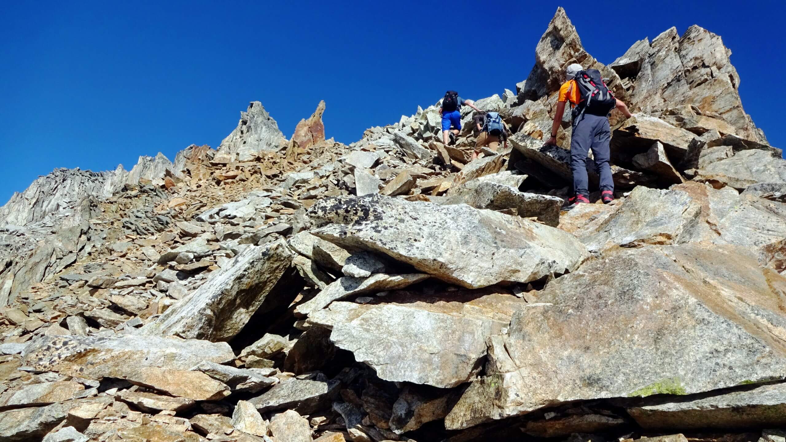 Nach 10 Stunden im Schlafsack und den ersten Sonnenstrahlen geht es freudig zur Sache und wir folgen Dominic – der zielsicher die ideale Route findet – zum Gipfel des Löffelhorns. Ein überaus gutes Gefühl. Das Gelände am Grat ist grob-blockig und im Grossen und Ganzen recht stabil. Auf diese Weise bereiten auch die steileren Abschnitte vollendetes Vergnügen. Für einmal kein sandiges, kieseliges Rutschgelände. Toll, sehr empfehlenswerter Gipfelanstieg, welcher ganz gut ohne Seil begangen werden kann. Nur bei der Gipfeltraverse gibt es kurze, ausgesetzte Stellen, bei welchen sich jedoch stabile Haltemöglichkeiten bieten. Und so stehen wir alsbald zufrieden am Gipfel.