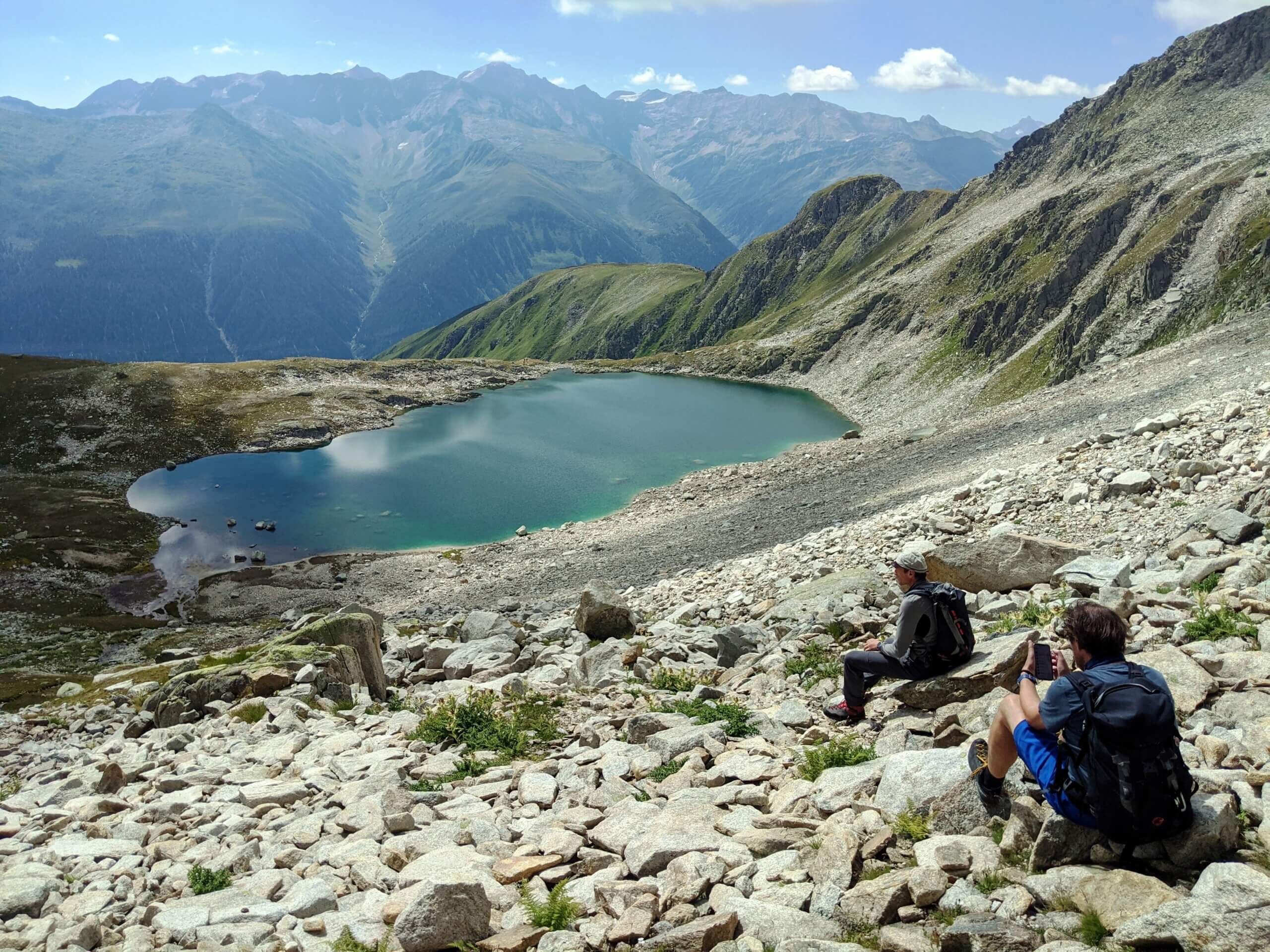 Beim Abstieg verweilen wir einen Moment oberhalb des Panorama-verzierten Trützisee und spüren kurz «die magische Leichtigkeit des Seins».